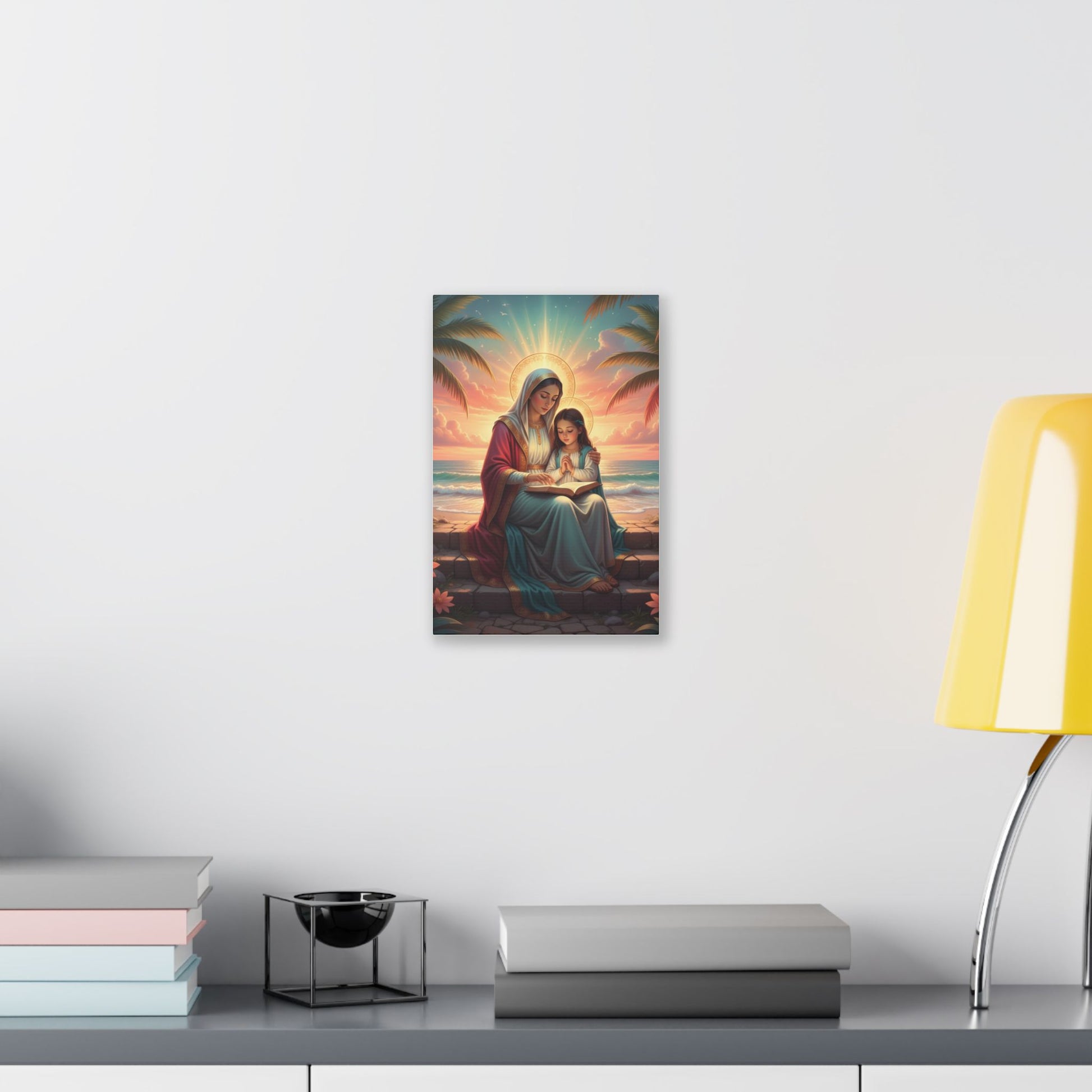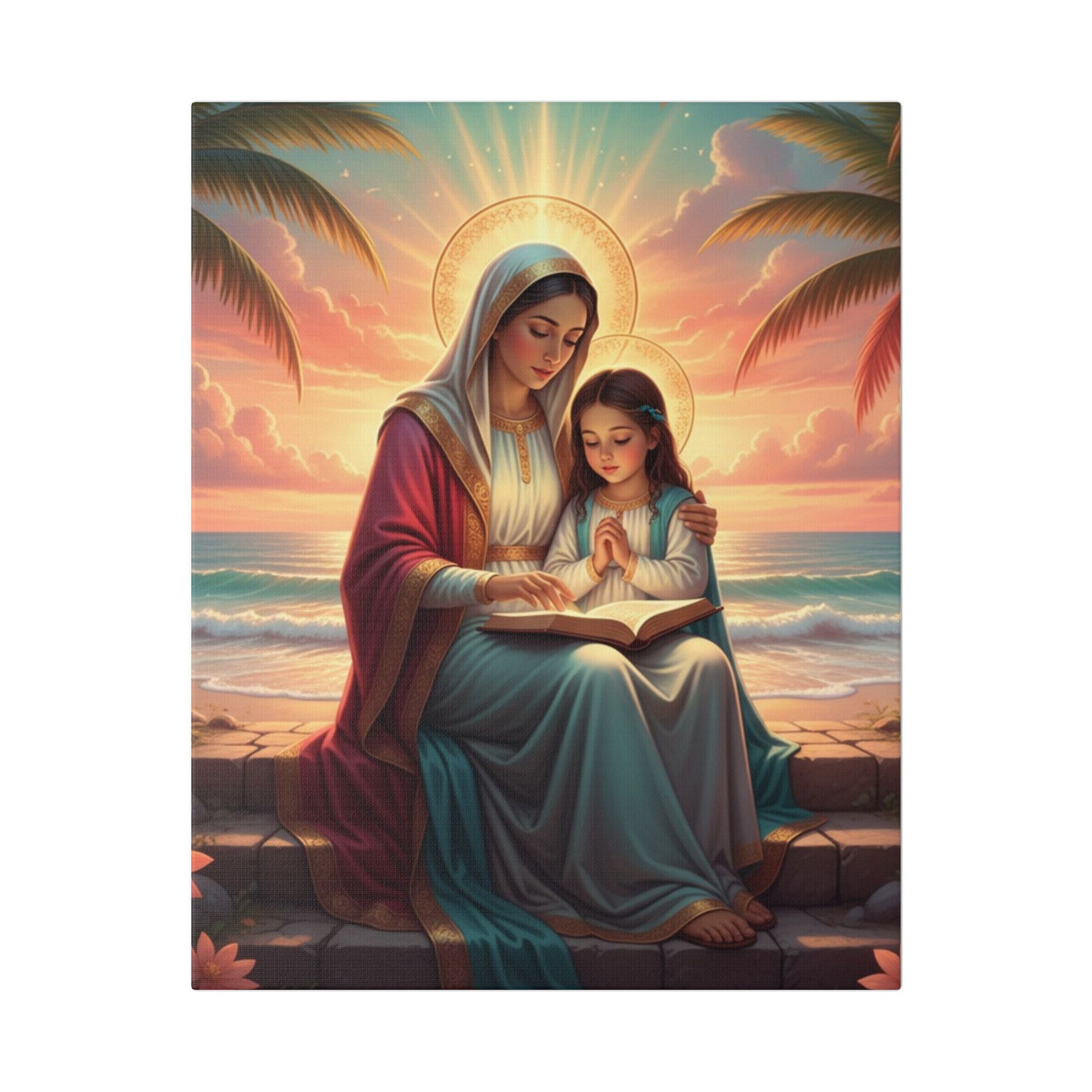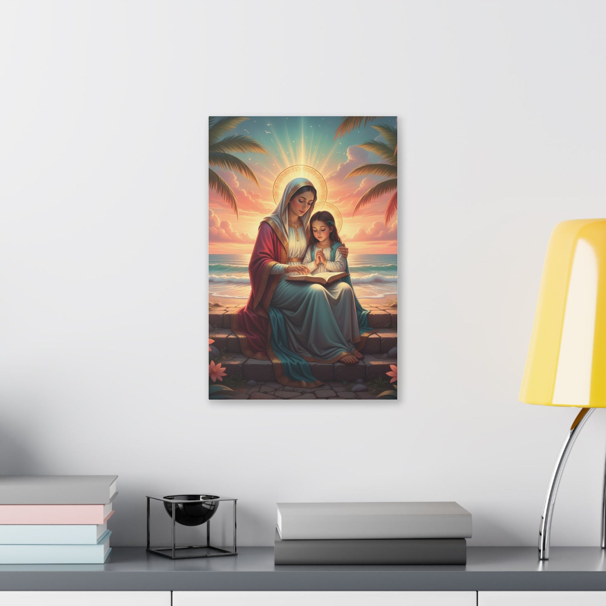 A classic stretched canvas print that brings a gentle, reverent moment into any living space. Soft, luminous colors capture a serene seaside scene of a mother and child in quiet prayer, rendered with warm sunrise tones and delicate halo light. The heavy-weight polyester canvas and hand-crafted pinewood frame give this piece a substantial, gallery-quality presence. It arrives ready to hang with a sawtooth hanger and screws, so it can be placed above a mantel, in a nursery corner, or as a calming focal point in a meditation nook. Available in multiple orientations and sizes to suit walls large and small.