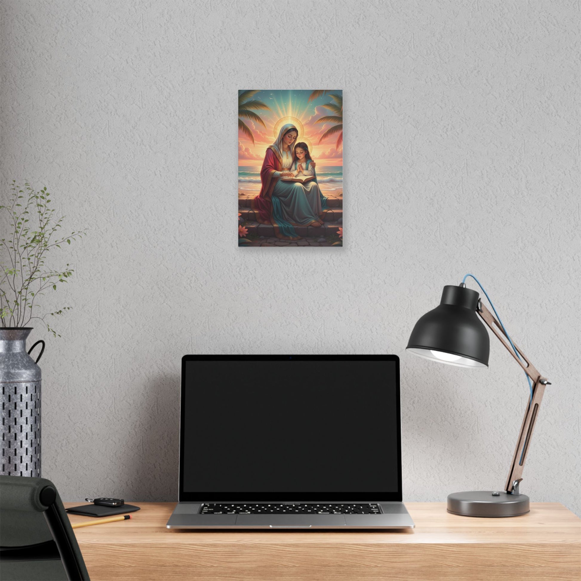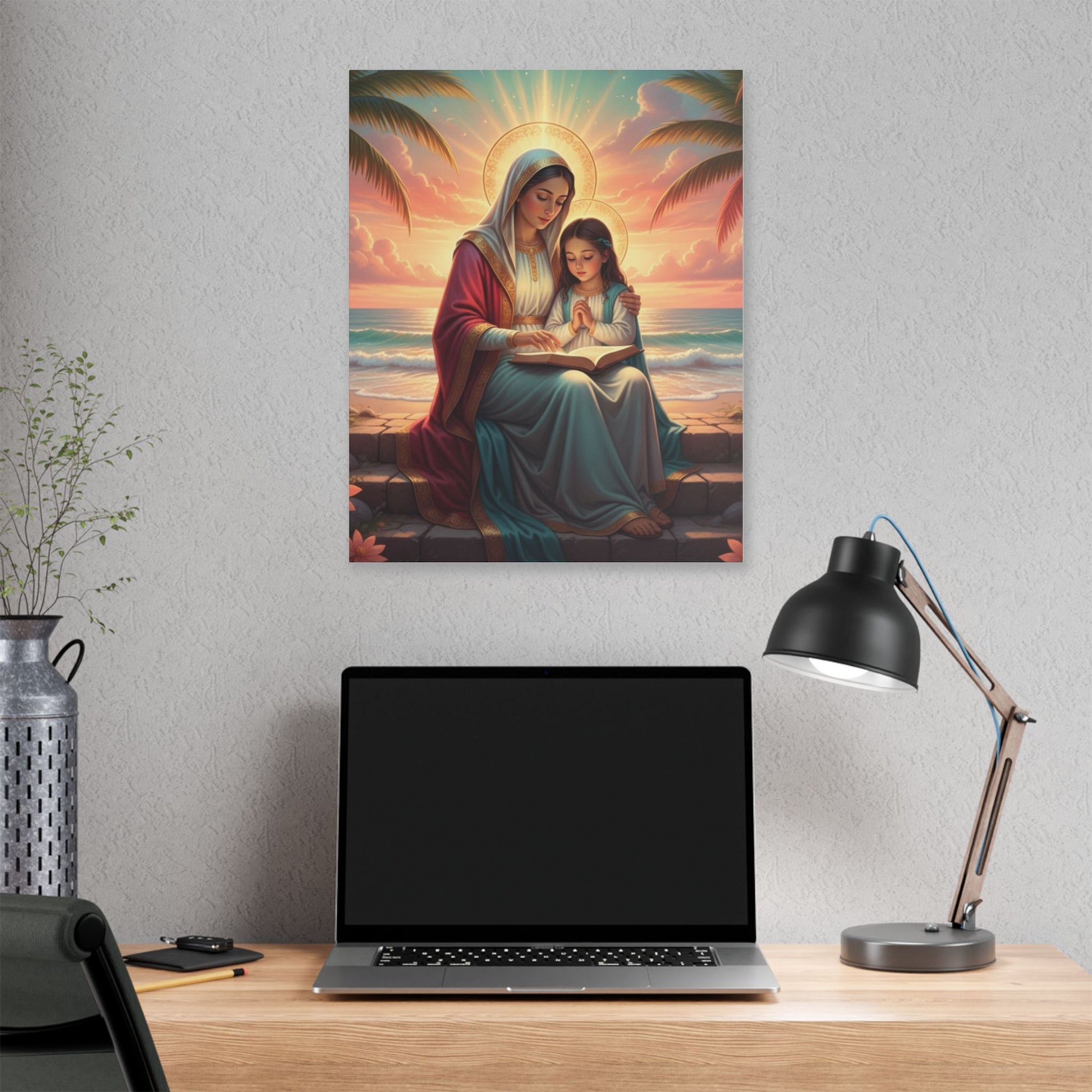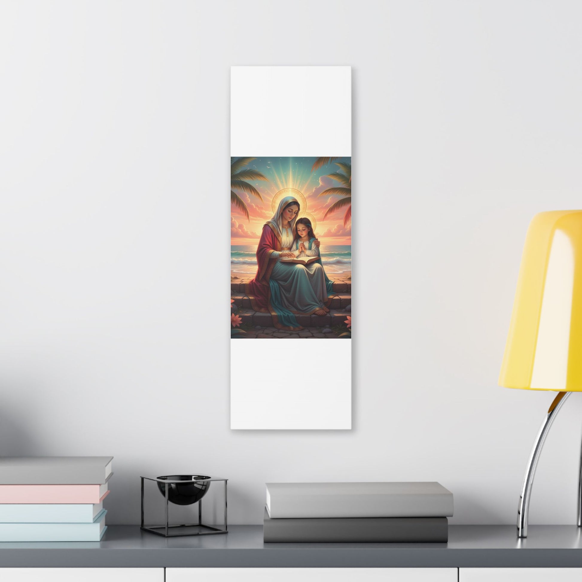 A classic stretched canvas print that brings a gentle, reverent moment into any living space. Soft, luminous colors capture a serene seaside scene of a mother and child in quiet prayer, rendered with warm sunrise tones and delicate halo light. The heavy-weight polyester canvas and hand-crafted pinewood frame give this piece a substantial, gallery-quality presence. It arrives ready to hang with a sawtooth hanger and screws, so it can be placed above a mantel, in a nursery corner, or as a calming focal point in a meditation nook. Available in multiple orientations and sizes to suit walls large and small.